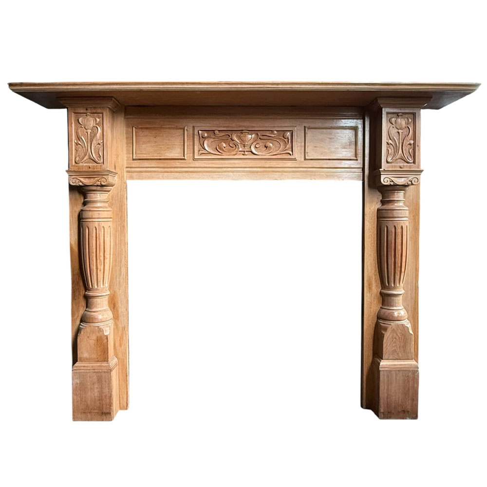 Turned pine columns support the generous mantel shelf, giving the piece strong architectural presence. The fluted detailing and carved panels add depth and refinement, while the warm tone of the pine highlights the natural grain beautifully.