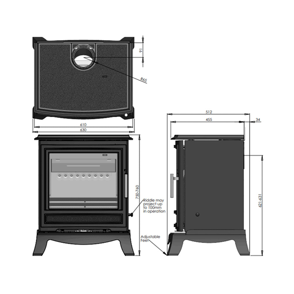 - High-quality cast iron top plate, top blanking plate for rear flue connections and base unit (pre-fitted) with adjustable feet for levelling, providing flexibility when installing the stove.