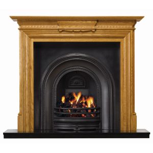 The Chatsworth wood mantel is available in a choice of finishes: Rich Oak, Waxed Oak, Mahogany Stained Cedar, Lacquered Antique Pine, Waxed Antique Pine.