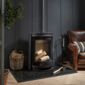 Featuring a 7kw nominal heat output, the cylindrical base of the Hoxton benefits from a large viewing glass to allow for an expansive view of the flames. A click closure mechanism ensures optimum safety and prevents any debris from escaping from the stove door.